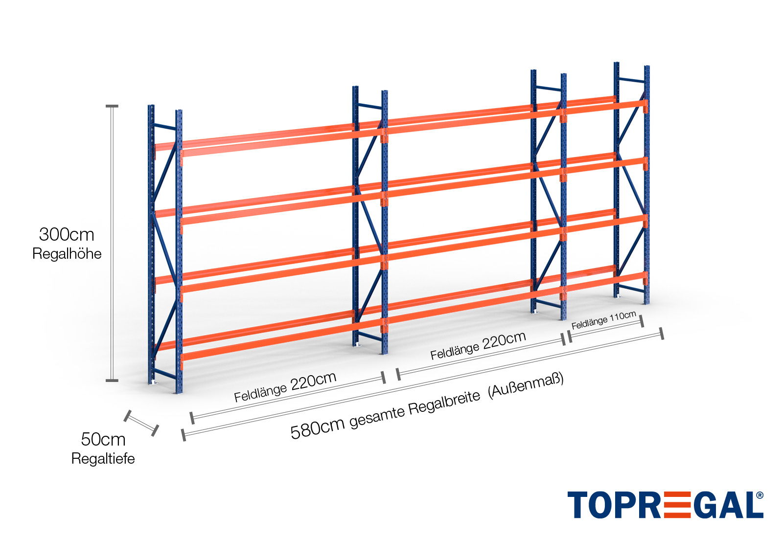 All data refer to evenly distributed loads. When loaded, the shelf load and field load must not be exceeded. In principle, the current guidelines on safety and health at work (german DGUV Rule 208-061) apply during use. TOPREGAL accepts no liability for accidents/damage caused by improper use. Our expert advisory team will be pleased to answer any questions you may have. Dimensions given are approximate and may deviate by a few centimetres. Contact us if you need the exact dimensions for your desired product.