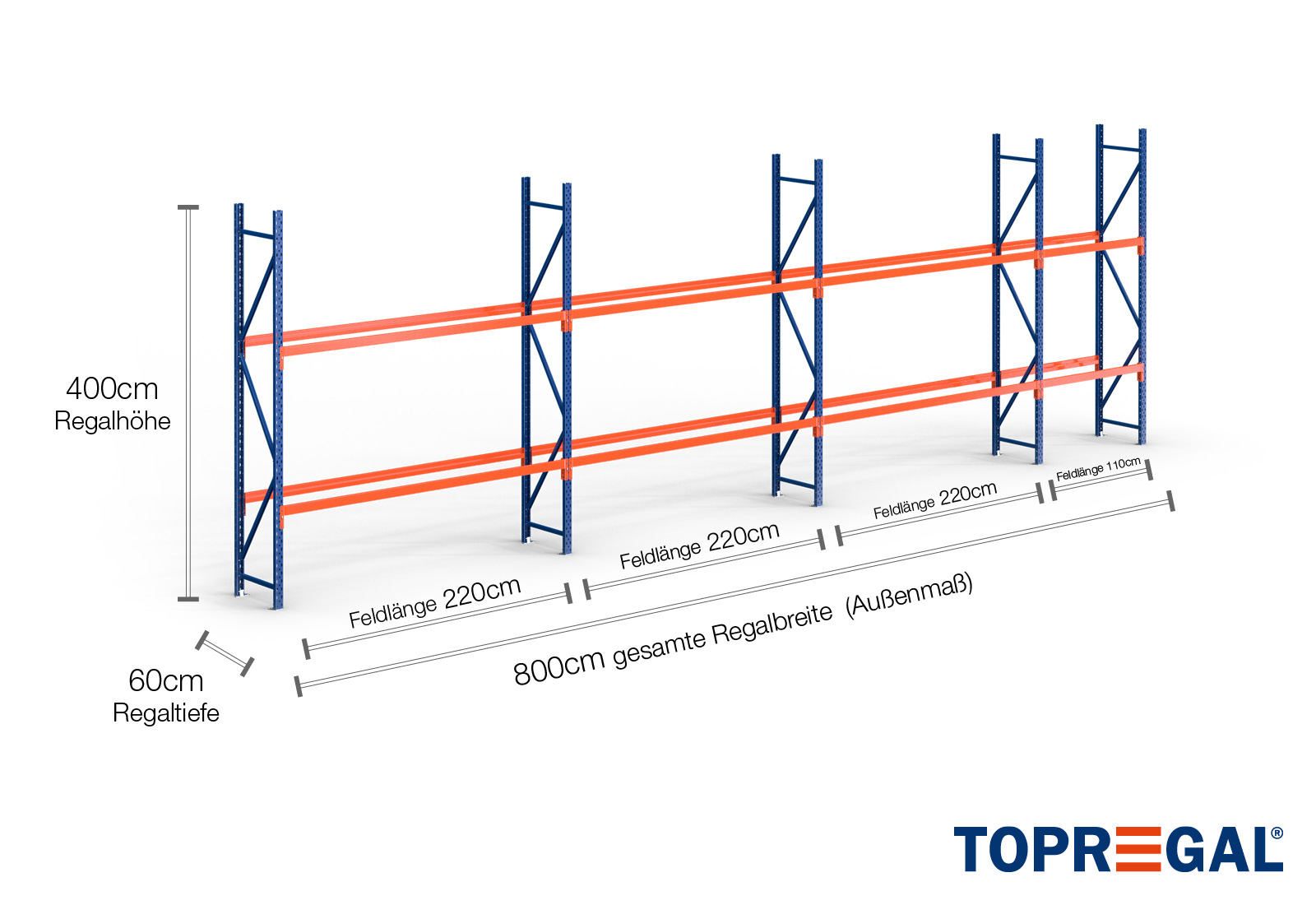 All data refer to evenly distributed loads. When loaded, the shelf load and field load must not be exceeded. In principle, the current guidelines on safety and health at work (german DGUV Rule 208-061) apply during use. TOPREGAL accepts no liability for accidents/damage caused by improper use. Our expert advisory team will be pleased to answer any questions you may have. Dimensions given are approximate and may deviate by a few centimetres. Contact us if you need the exact dimensions for your desired product.