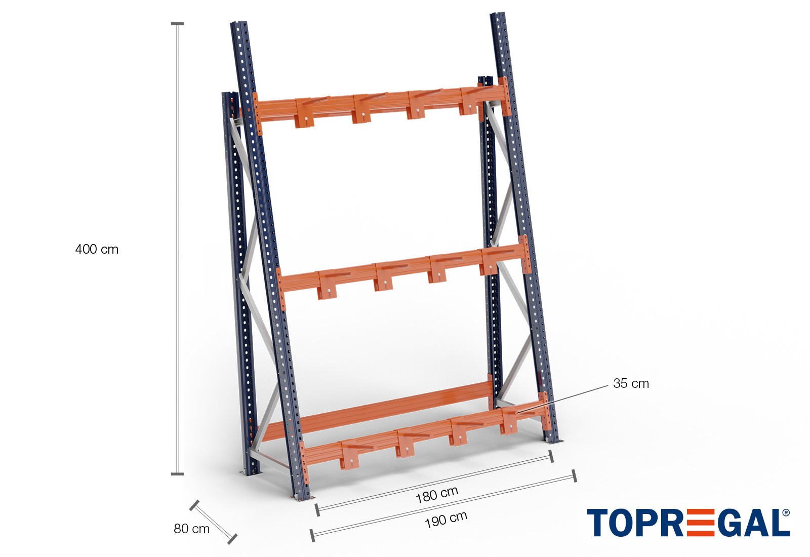1,9 m vertical rack VR1500 / 4 m high / 80 cm deep / 3 levels / 12 x cantilever separator 350 mm