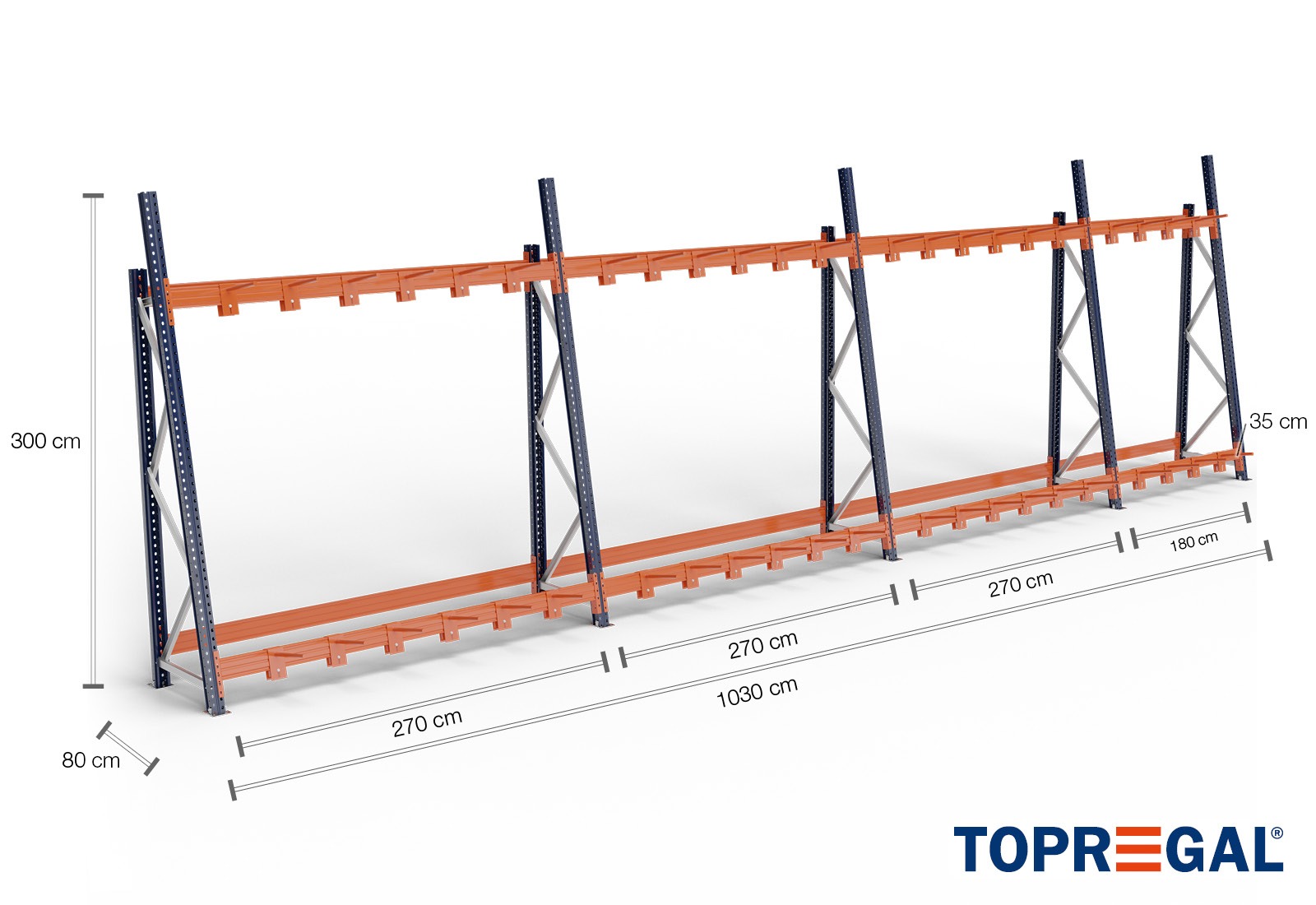 10,3 m vertical rack VR1500 / 3 m high / 80 cm deep / 2 levels / 44 x cantilever separator 350 mm