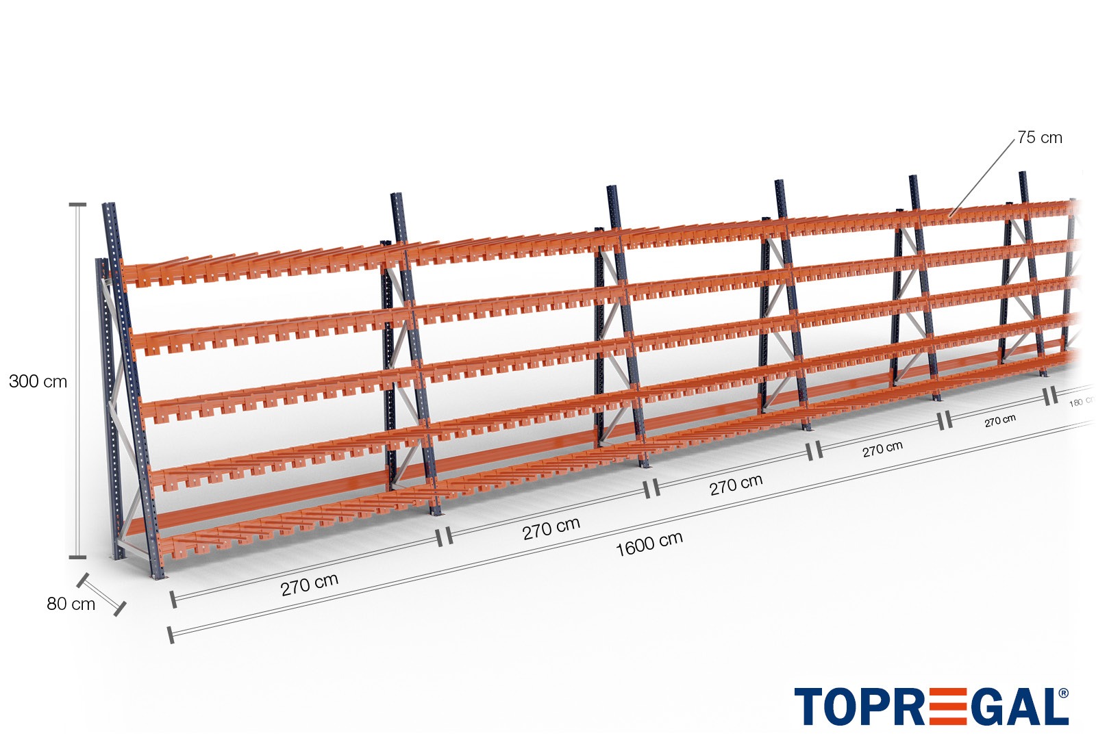 This fully configured vertical rack is ideal for indoor storage of lightweight long goods. The practical vertical storage arrangement gives you a quick overview of your stock, which is easy to remove. This type of storage also saves a great deal of space. The vertical rack from TOPREGAL can be used for worktops, longer wooden profiles in DIY stores or in the ski department of sporting goods shops, for example.