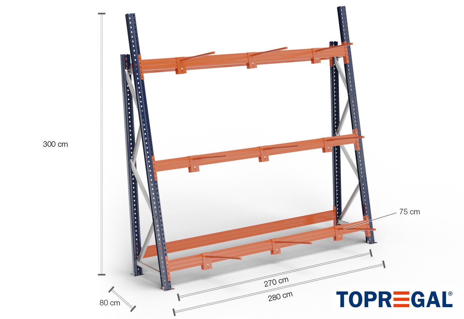 2,8 m vertical rack VR1500 / 3 m high / 80 cm deep / 3 levels / 9 x cantilever separator 750 mm