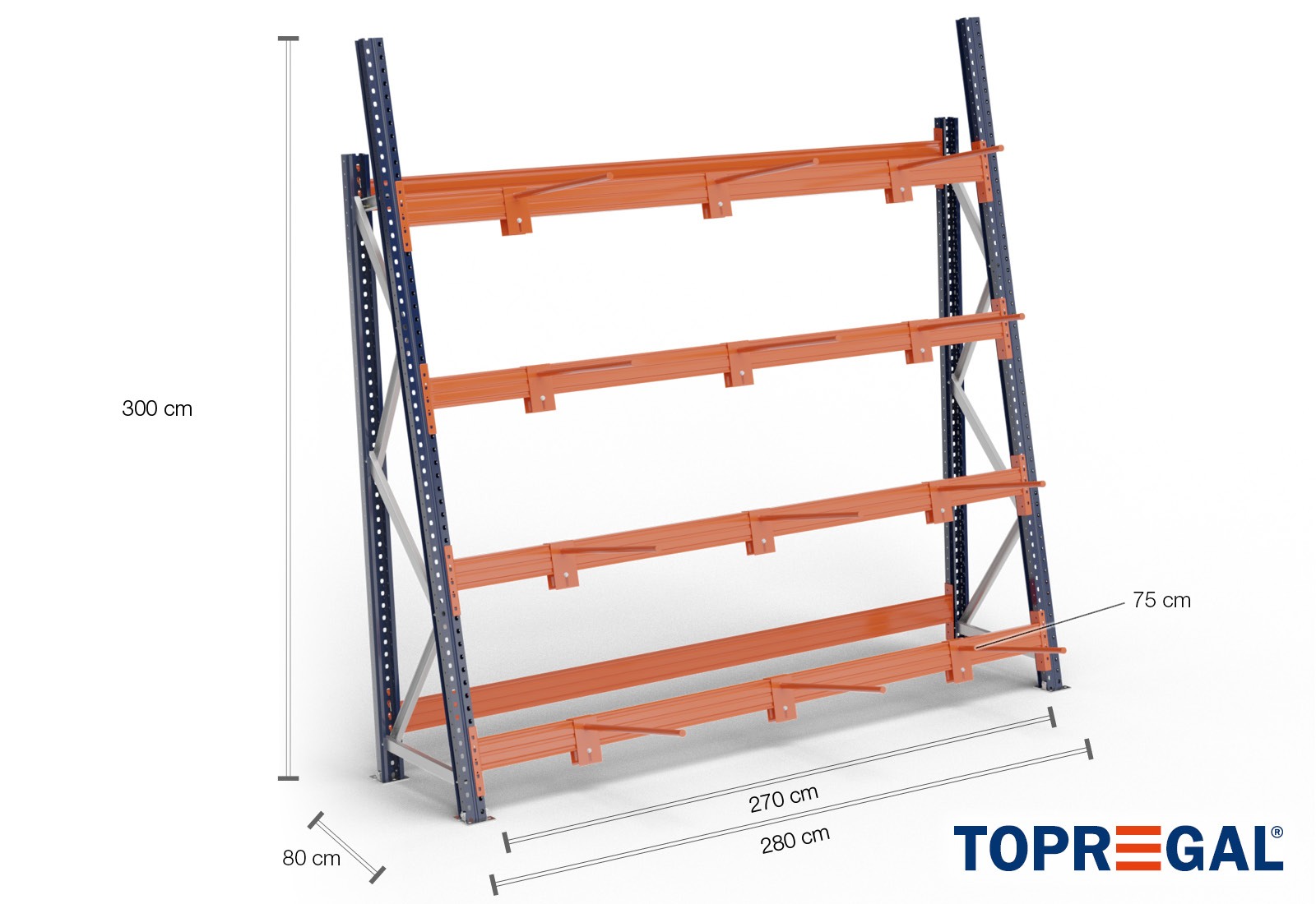 2,8 m vertical rack VR1500 / 3 m high / 80 cm deep / 4 levels / 12 x cantilever separator 750 mm