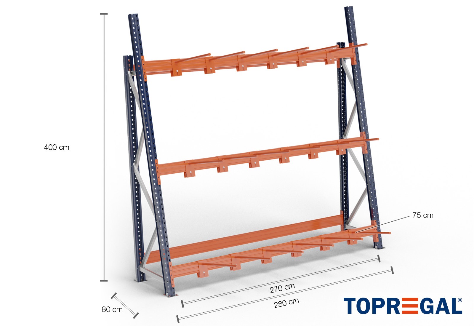 2,8 m vertical rack VR1500 / 4 m high / 80 cm deep / 3 levels / 18 x cantilever separator 750 mm