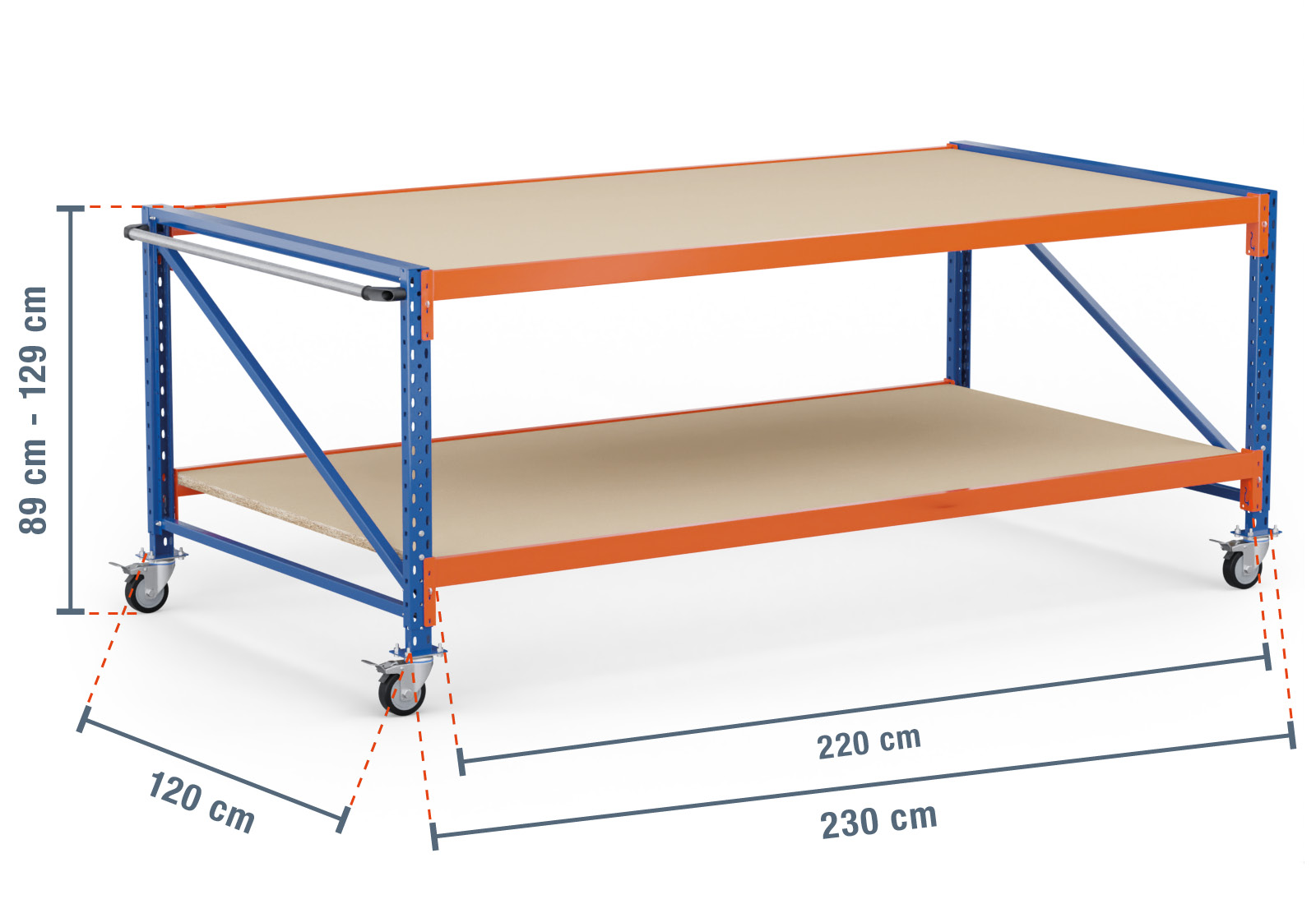 The outer dimension of this worktable is 2,3 m, where the usable contact area, known as the inside dimension, is 10 cm shorter. This can be used for easy storage of dry goods, such as screws, assembly parts and other items.