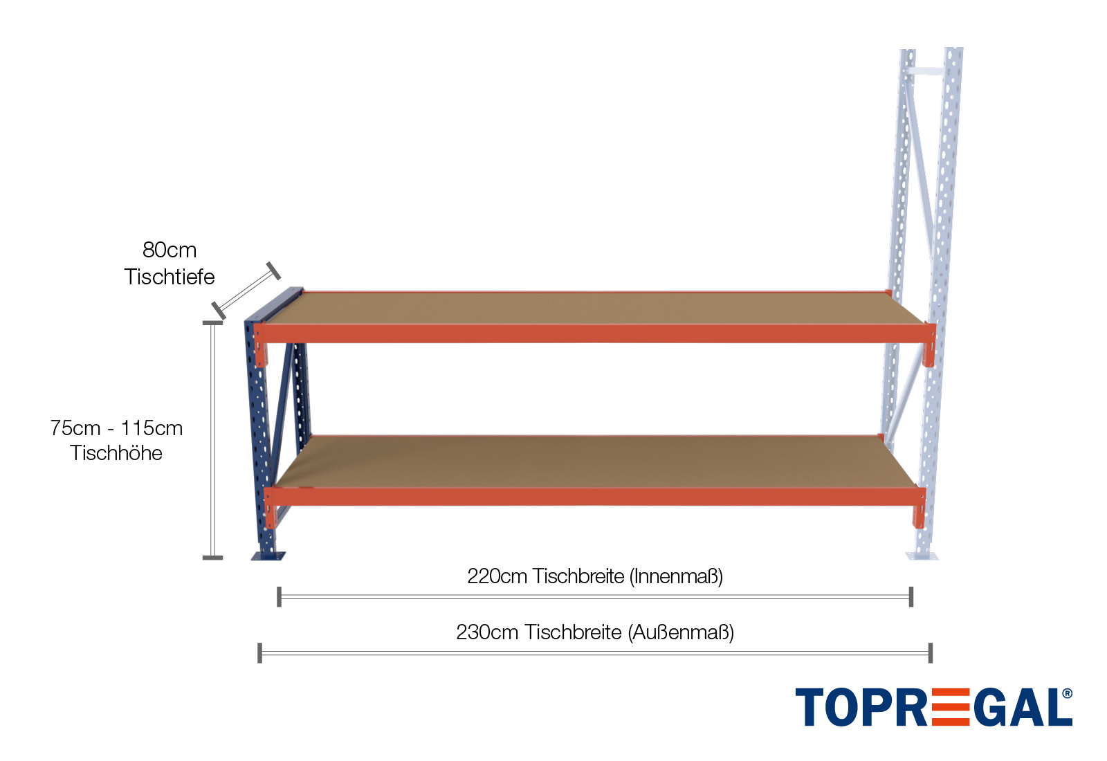 This extension table with compact dimensions of 2,3 m x 80 cm x 0,75 m is an easy way to extend your TOPREGAL storage rack. Thanks to the modular system, you can attach this extension table to any rack type from our storage rack range. This includes our tyre racks, kanban racks, workbenches and much more.