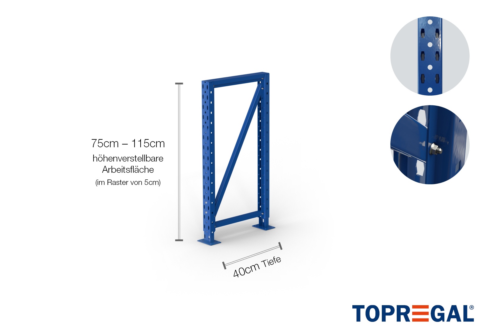 • Complete packing-table storage rack upright incl. foot parts and struts, height adjustable from 75–115cm, 40cm deep