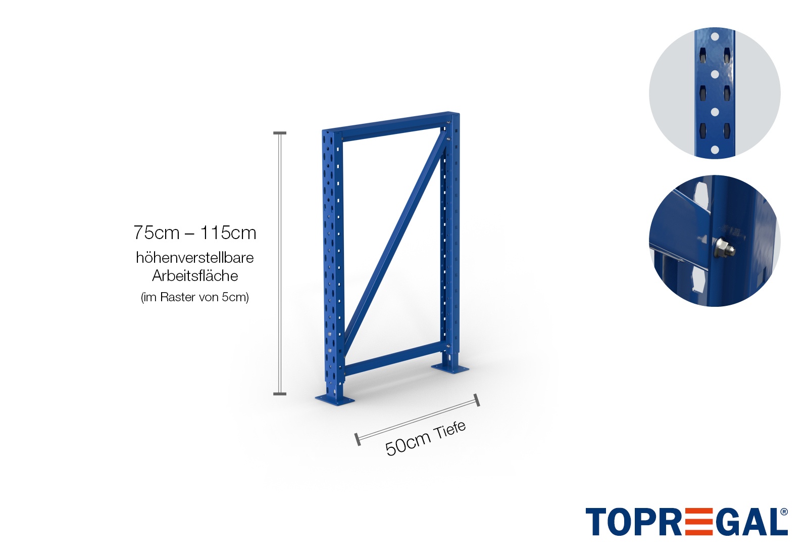 • Complete packing-table storage rack upright incl. foot parts and struts, height adjustable from 75–115cm, 50cm deep