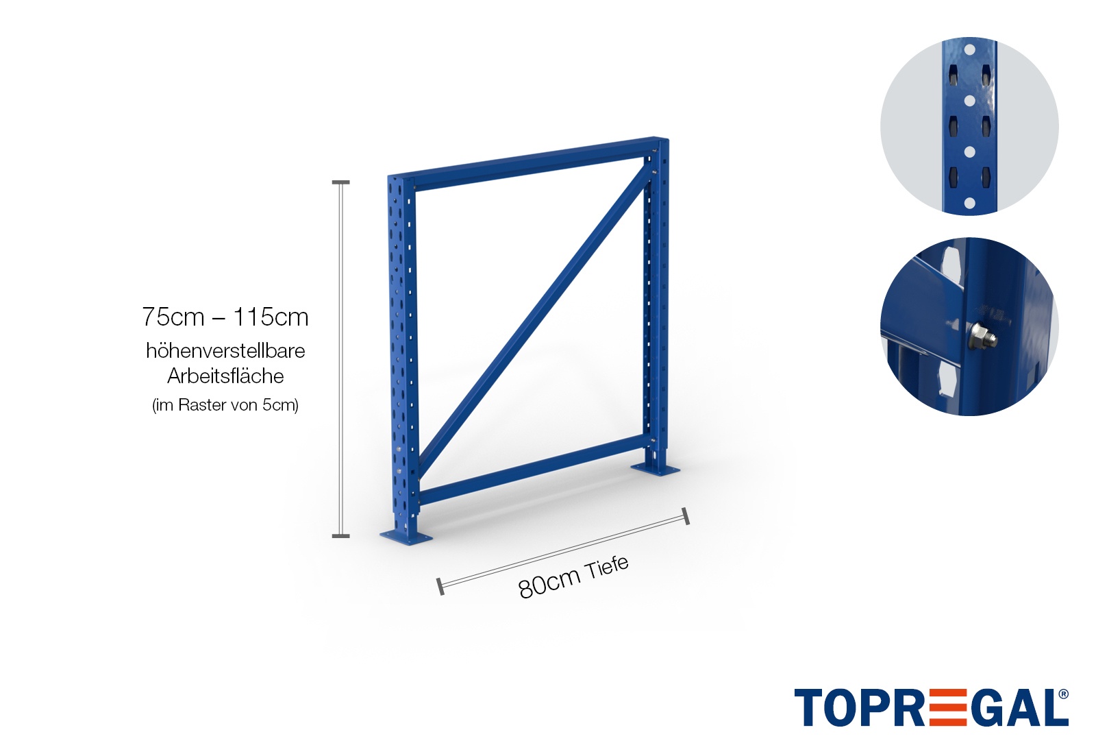 • Complete packing-table storage rack upright incl. foot parts and struts, height adjustable from 75–115cm, 80cm deep