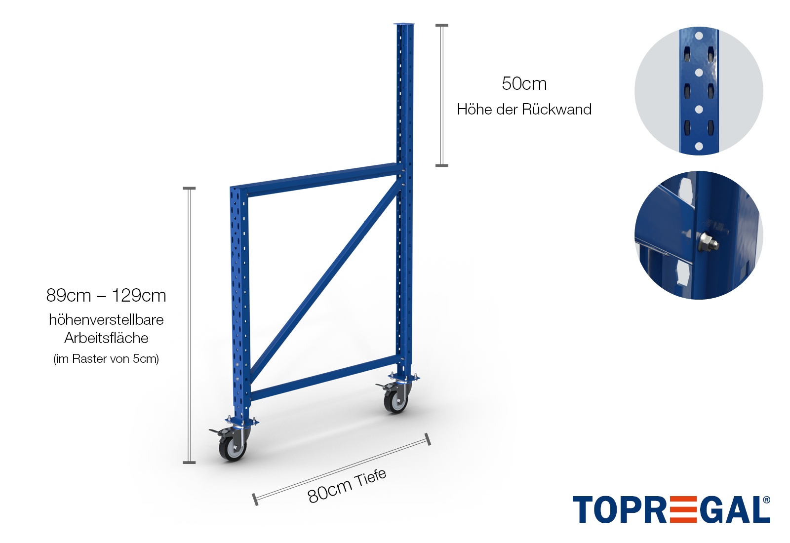 Packing-table storage rack upright 89–129cm height-adjustable / 80cm deep with castors (for perforated back panel)